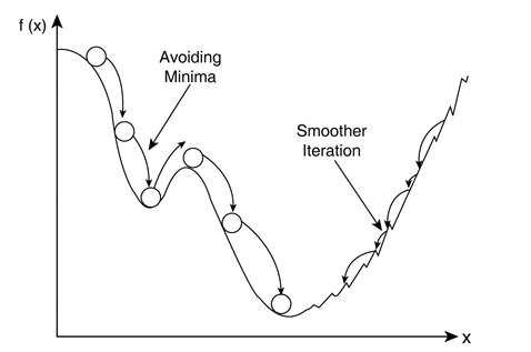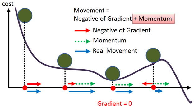 => (기울기에 관성을 부과하여 언덕에서 공을 굴렸을때, 낮은 언덕은 공의 관성을 이용하여 쉽게 넘어갈 수 있게 하여 지역 최소값을 탈출 할 수 있게 한다)