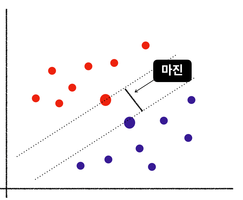 - 두클래스 사이에 가장 넓이가 큰 분류 경계선을 찾기떄문에 lage margin classification이라고도한다