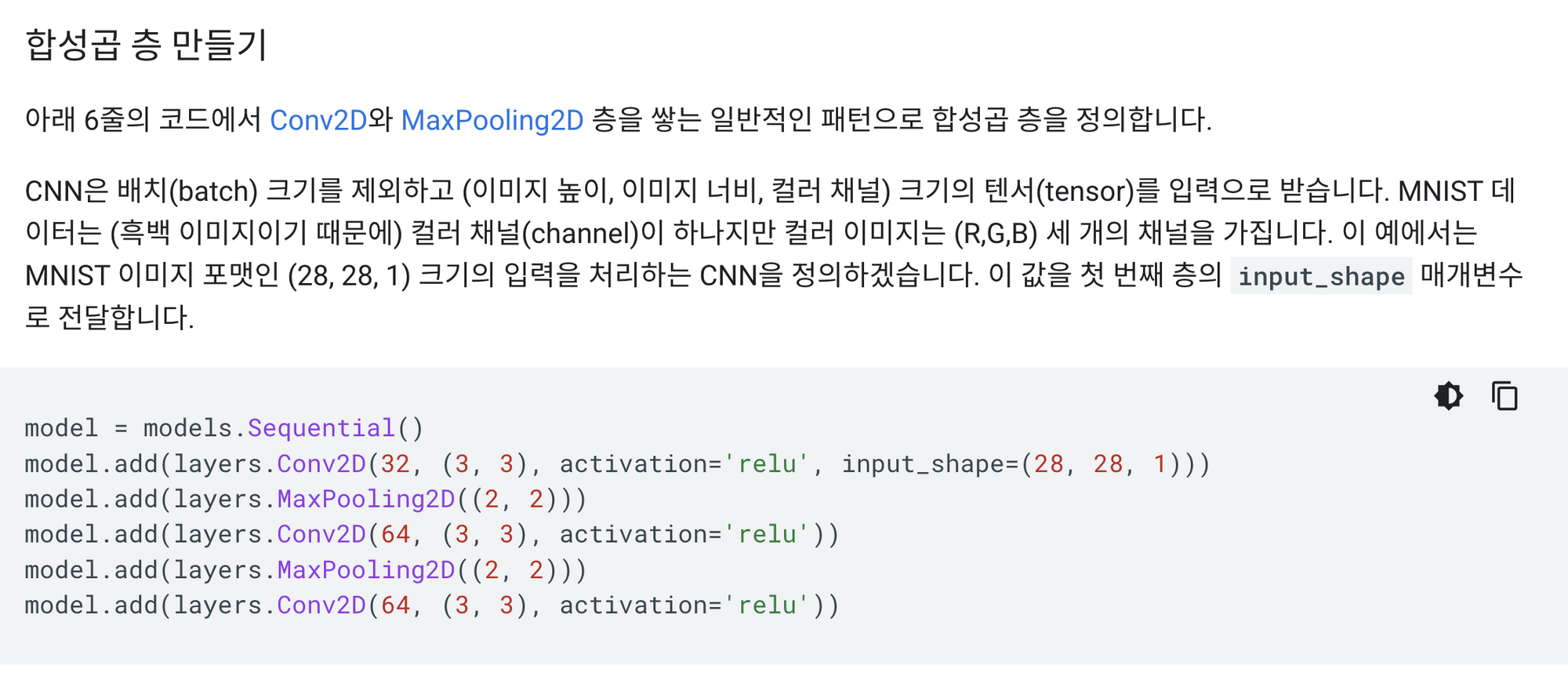 - Convolution 연산을 하면 필터(filters, kernel_size에 해당하는 filters 개수만큼)를 통과시켜서 filters 개수만큼 피처맵을 생성합니다.